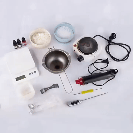 Materials Needed: Wax, essential oil, colored wax blocks, wick, pot, cooking pot, stirring stick, beaker, wick holder, perforator