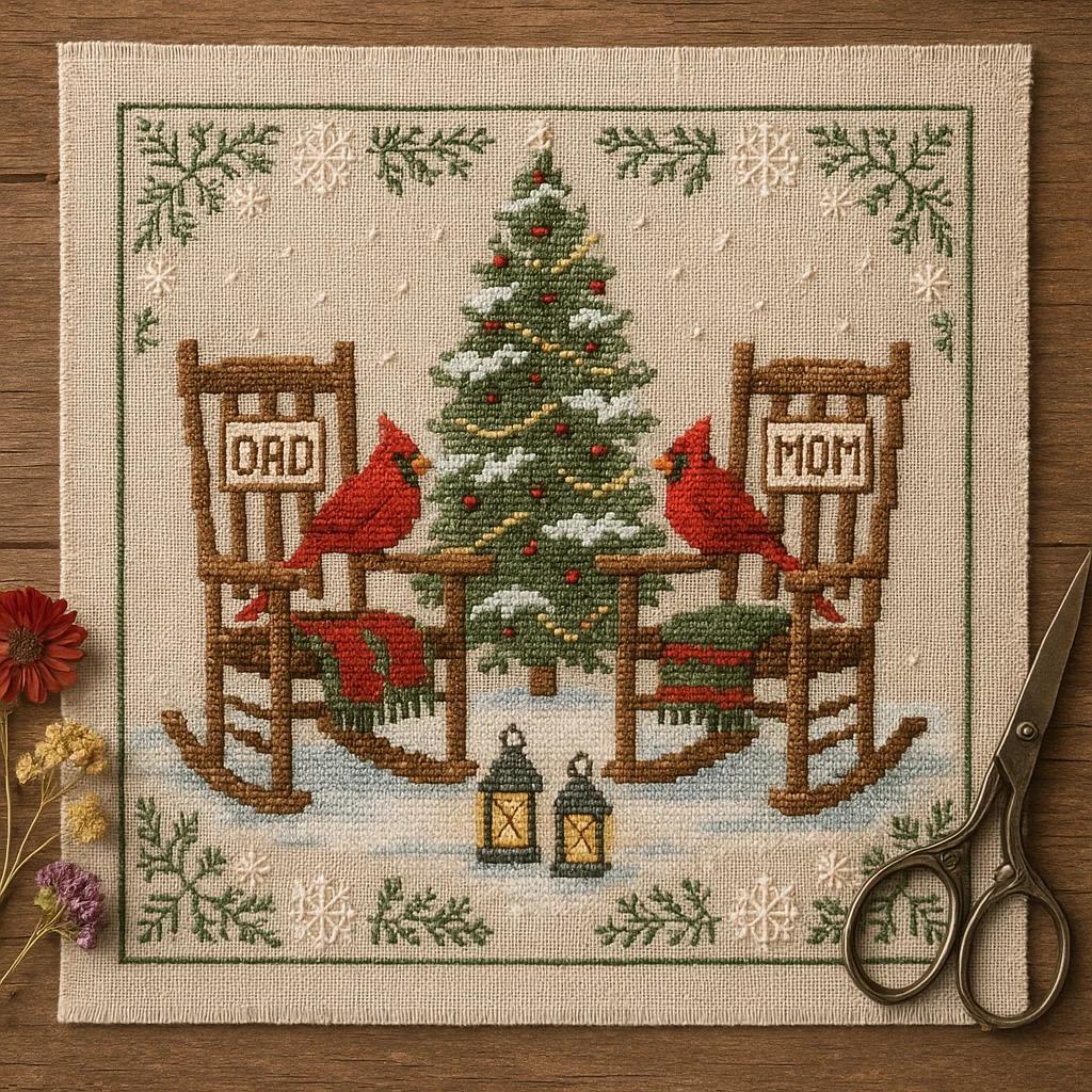 β€οΈHonor the memory of your loved ones and celebrate family traditions with our βMom & Dad Rocking Chairs with Memorial Cardinalsβ Cross Stitch Kit. This touching design features two rocking chairs labeled βMOMβ and βDAD,β adorned with symbolic red cardinals, a snow-dusted Christmas tree, and cozy winter detailsβmaking it a perfect project for creating a heartfelt memorial keepsake or a loving tribute to