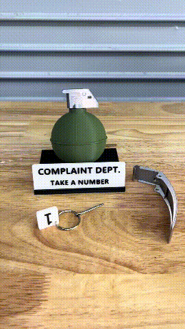 Make a statement with this funny and bold "Complaint Dept. - Take a Number" sign, featuring a realistic 3D-printed grenade replica.