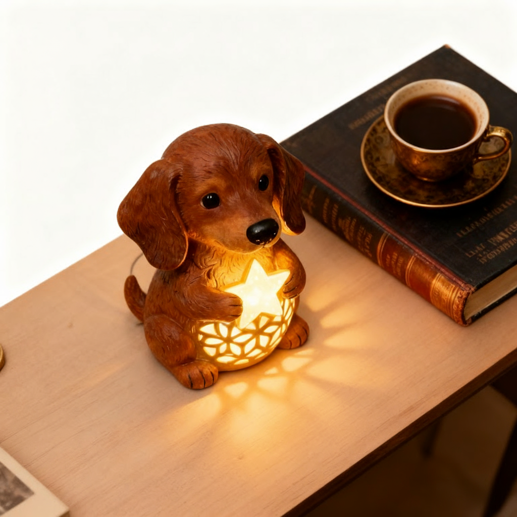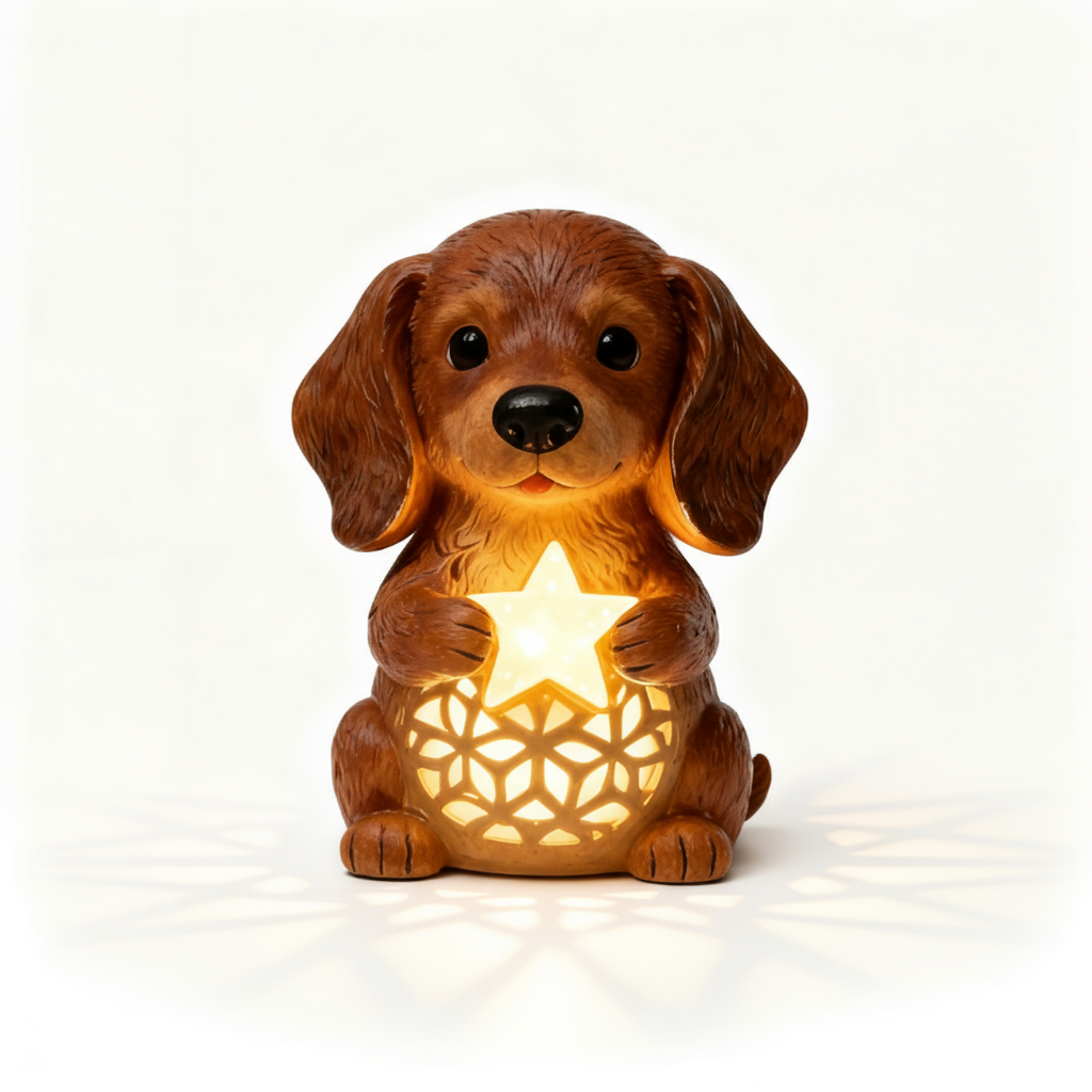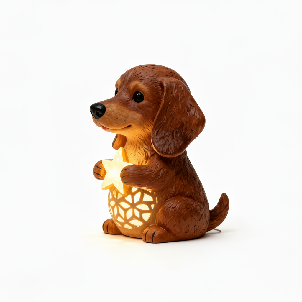 Meet the dachshund that holds a star just for you. Hand-crafted from durable resin and painted with care, this little pup isn’t just décor – it’s a heart-warming companion that lights up your nights.