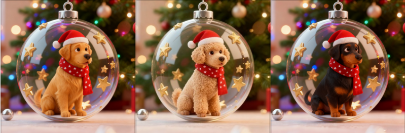 Each ornament is enclosed in a crystal-clear glass-style bauble, adorned with shimmering gold stars. Whether you hang them on your Christmas tree or display them on a mantel, they bring instant holiday cheer and charm to any space.