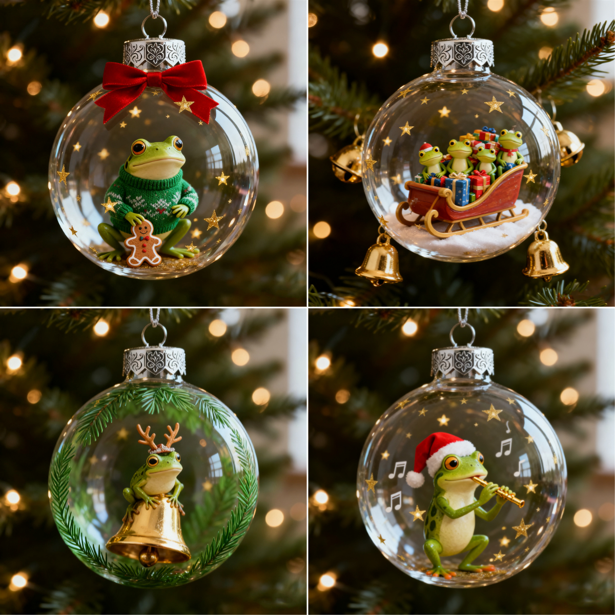 Discover the most charming Christmas collection! Each glass ornament features adorable frogs in festive scenes - from sweater-clad frogs with gingerbread to Santa frogs riding sleighs. Perfect for tree decorating or gifting! β¨