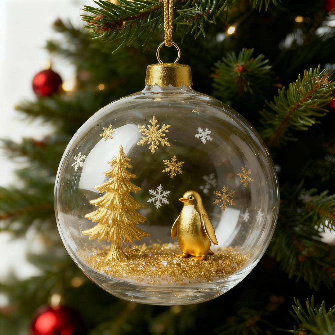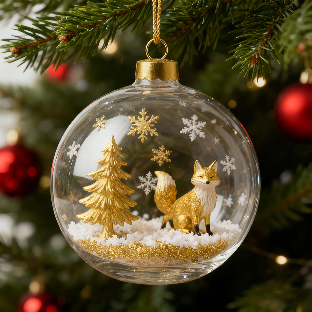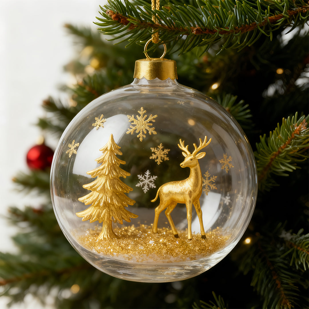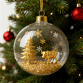 Our Golden Forest Christmas Ball Ornament captures the serene beauty of the forestβgraceful reindeer stroll among evergreen trees, surrounded by shimmering golden snowflakes, encased in a crystal-clear glass ball.