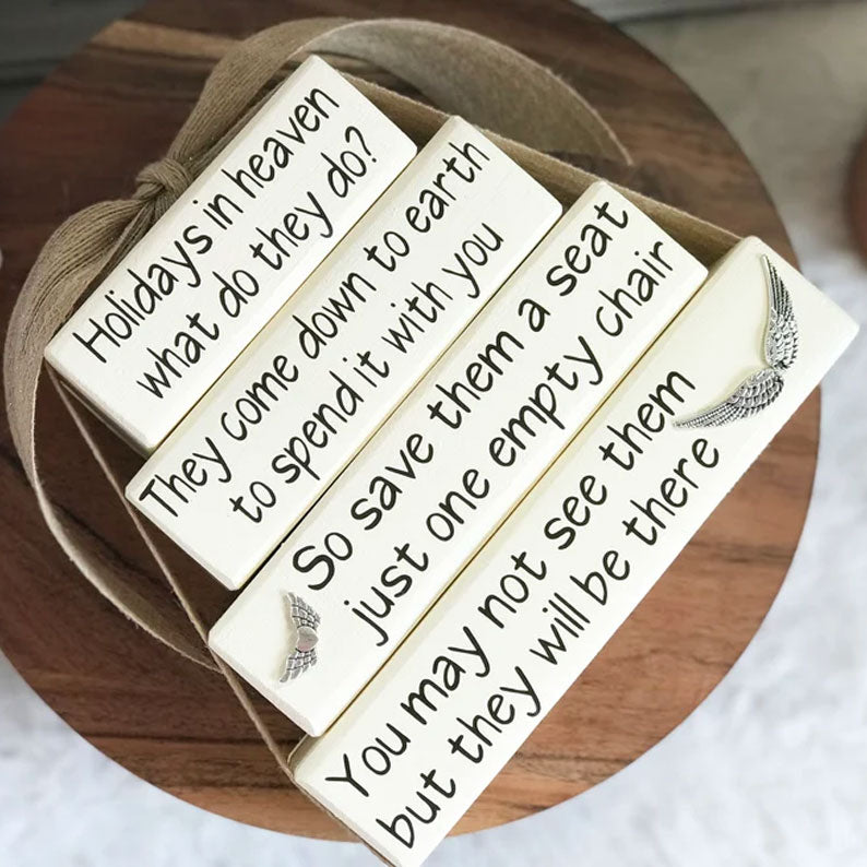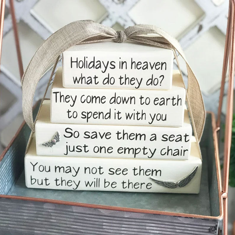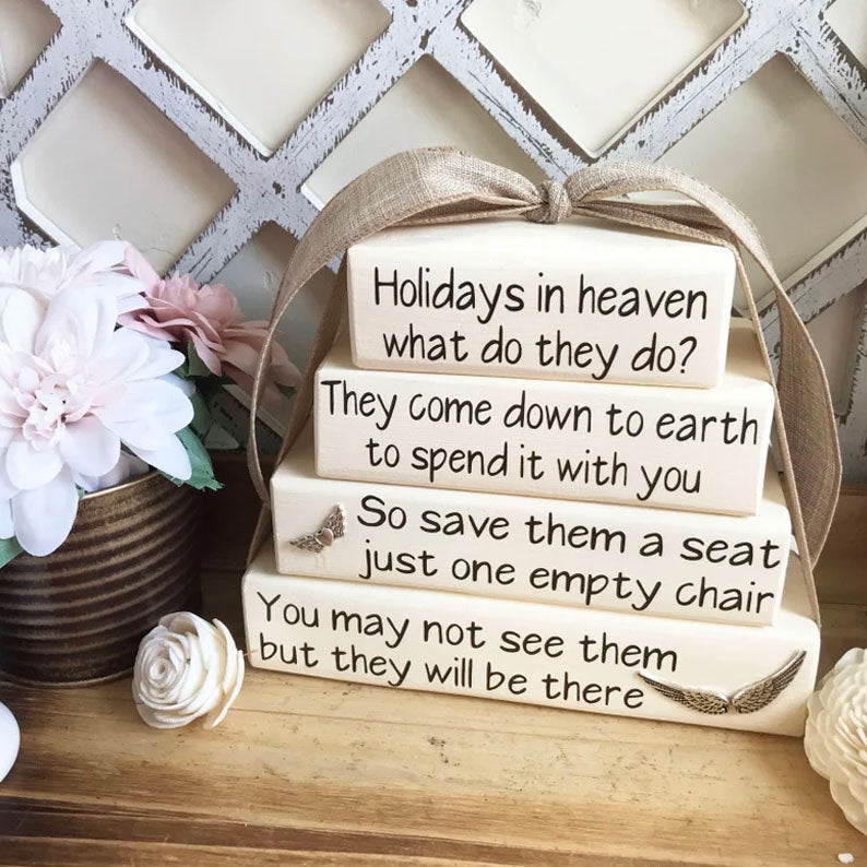 β€οΈHonor the memory of your loved ones this holiday season with our βHolidays in Heavenβ Memorial Block Set. This heartfelt collection of four stacked wooden blocks features a poignant message about loved ones in heaven joining your celebrations, offering comfort and a gentle reminder that theyβre never truly far.