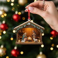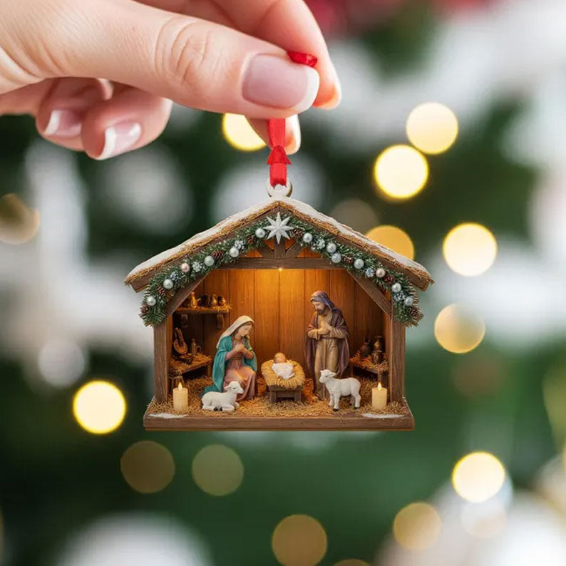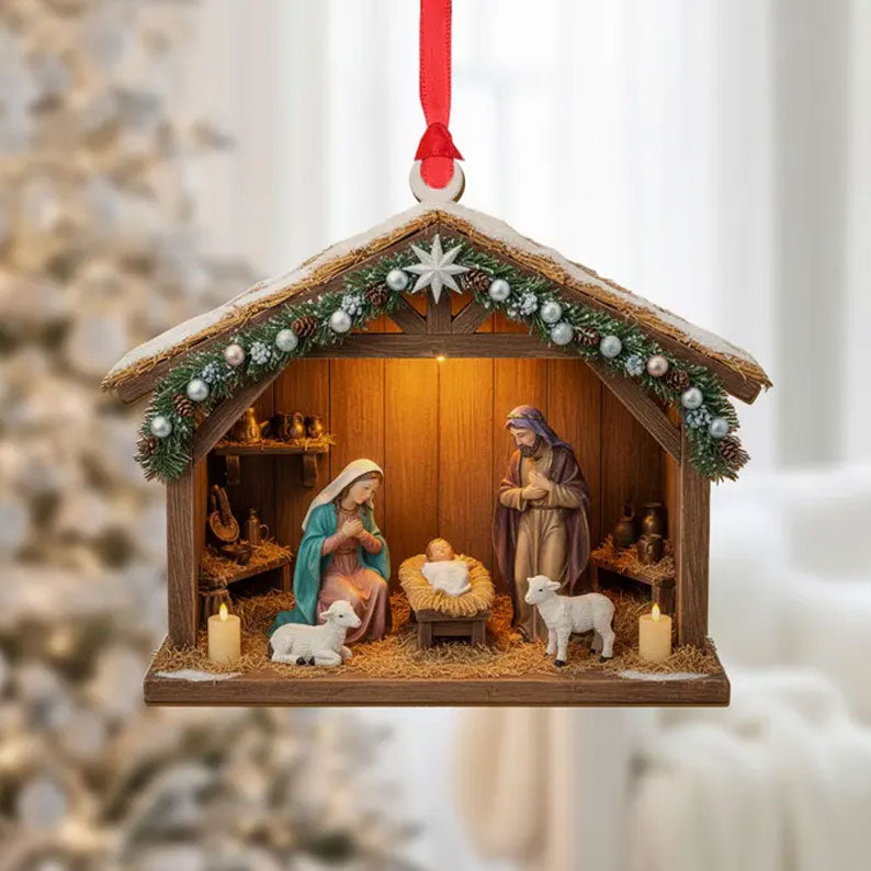 - The ornament depicts Mary, Joseph, and the baby Jesus in a rustic stable, surrounded by sheep and subtle barn details. A shining star adorns the roof, while delicate greenery, pinecones, and snow-like accents add festive charm. Every element is crafted to evoke the humility and wonder of the first Christmas.