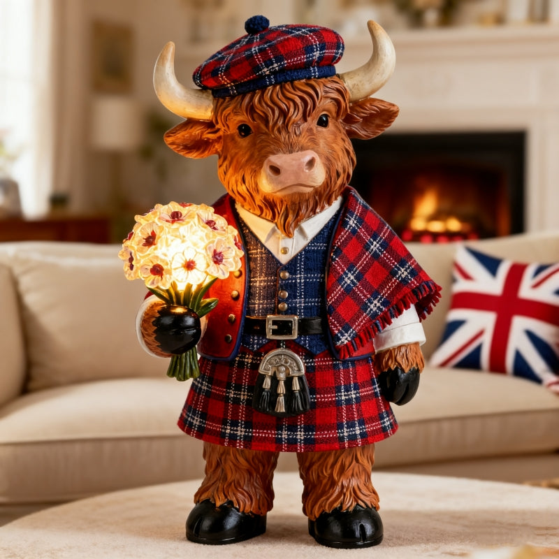 Inspired by this, we created a lamp of a cow in a tartan kiltΒ and holding a bouquet of flowers.
