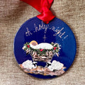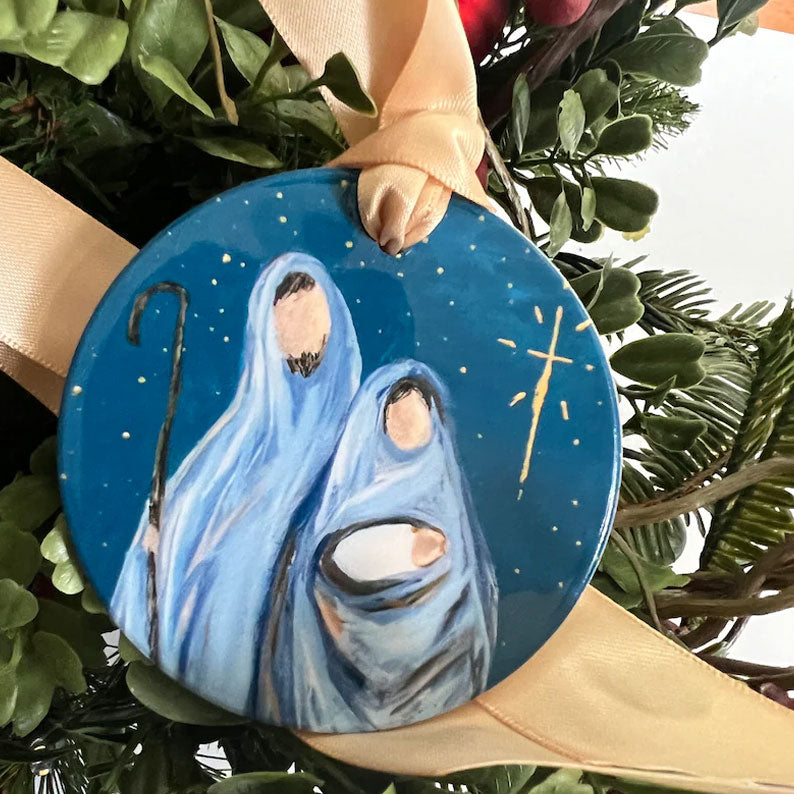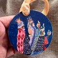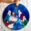 Vibrant Three Wise Men Design: The ornament features the three Magi in rich, colorful robesβeach adorned with intricate patterns and crownsβset against a deep blue, starry background. The hand-painted details capture the reverence and journey of the Wise Men as they bring gifts to the newborn king.